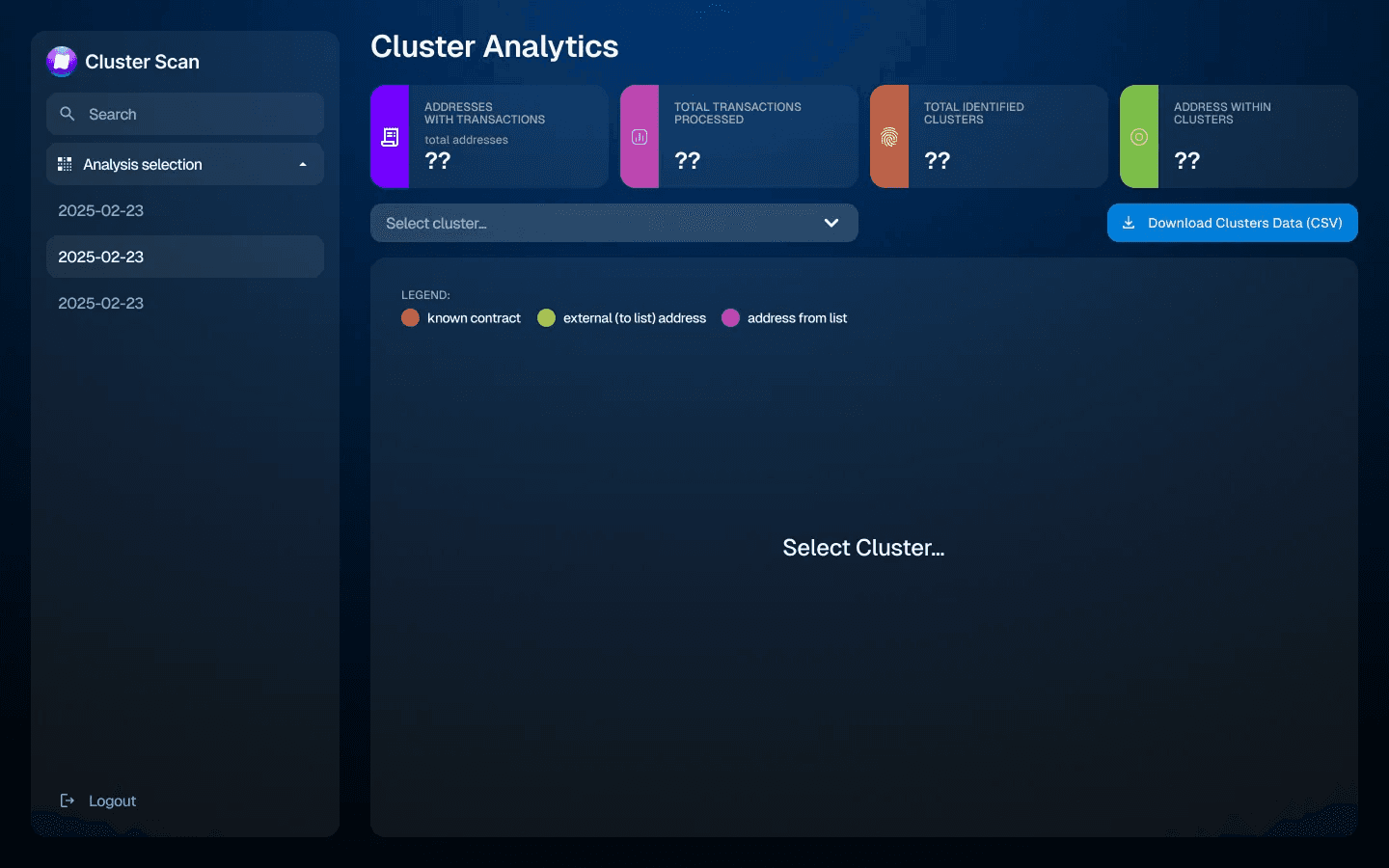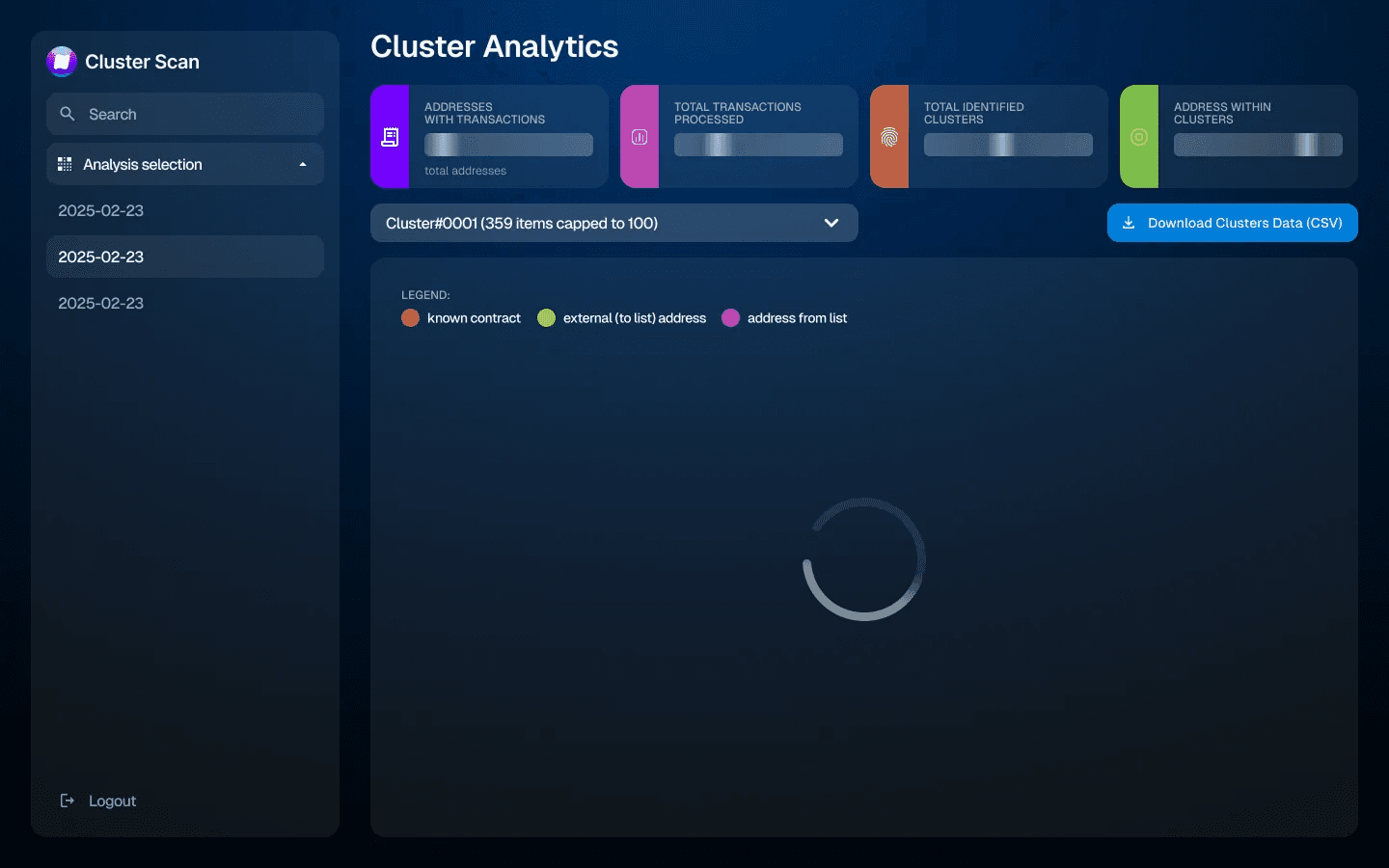 Through rich onchain signals and over 50 behavioral metrics, we provide visual dashboards and cluster graphs that make sense of complex wallet activity — at scale.